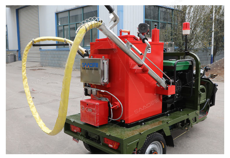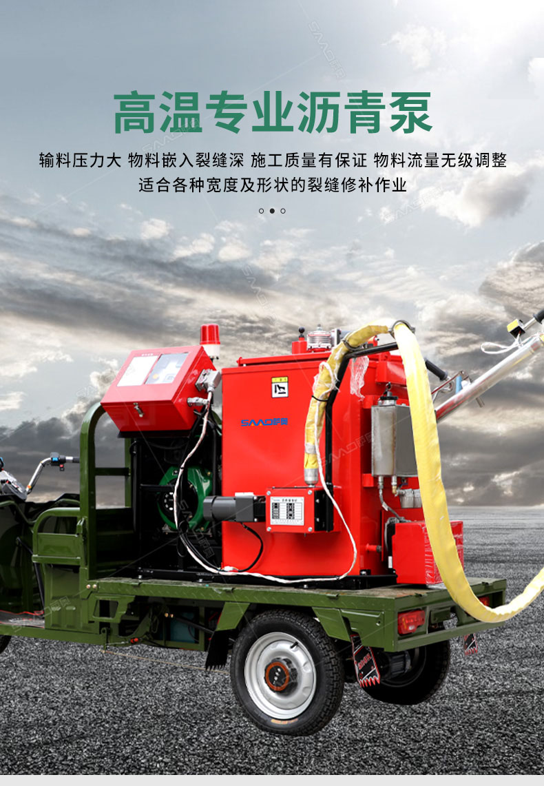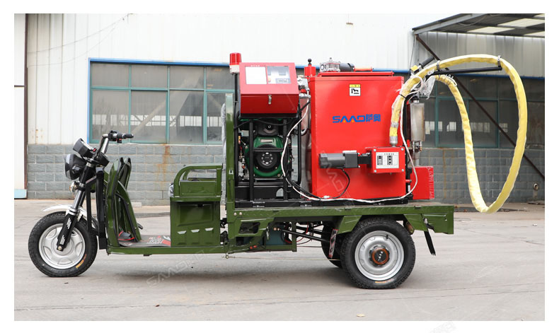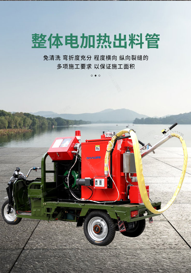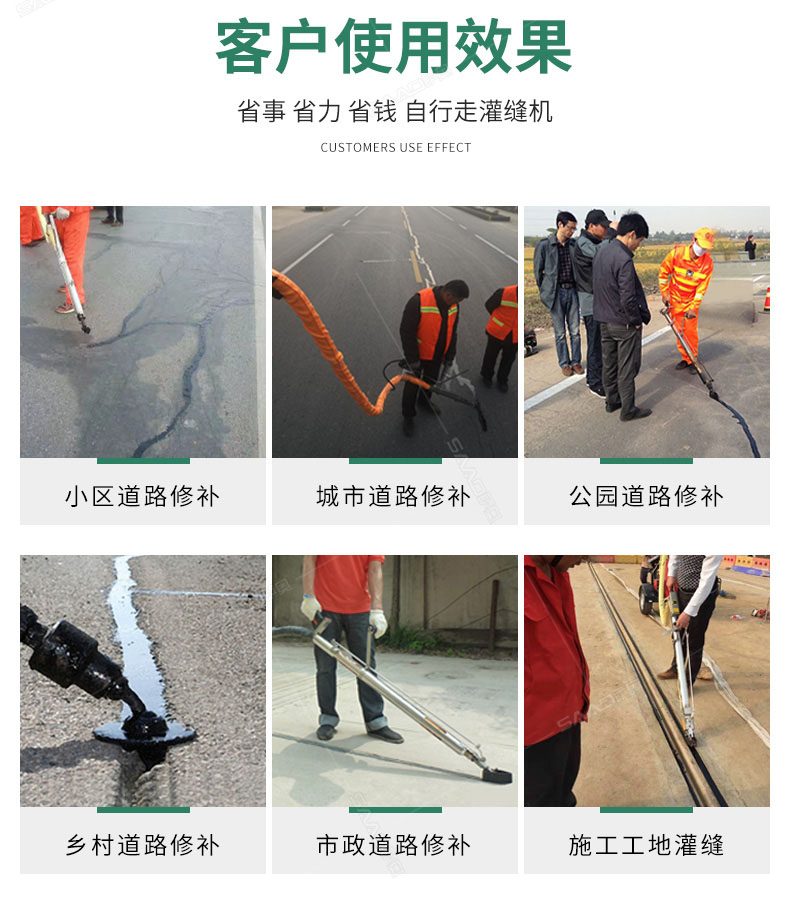汽油灌縫機(jī)主要有手推式和自行式手持灌縫管操作,采用進(jìn)口柴油燃燒器加熱。在工作時(shí)首先在料箱內(nèi)加入瀝青或灌縫膠,啟動(dòng)發(fā)電機(jī)供電,依次間斷打開導(dǎo)熱油泵開關(guān),燃燒器開關(guān),出料管加熱開關(guān);調(diào)整自動(dòng)溫控系統(tǒng)與材料的溫度相同,通過柴油燃燒器自動(dòng)加熱熔料箱內(nèi)導(dǎo)熱油開始升溫(拖式為強(qiáng)制循環(huán))使材料融化,溫度是通過自控系統(tǒng)來控制。溶料時(shí)間大約30-40分鐘左右。在材料融化、出料管溫度達(dá)到后可以進(jìn)行工作。手持灌縫管對(duì)正裂縫灌縫處理。瀝青泵的出料流量可調(diào)。在工作過程中隨時(shí)添加材料保證工作的連續(xù)性。