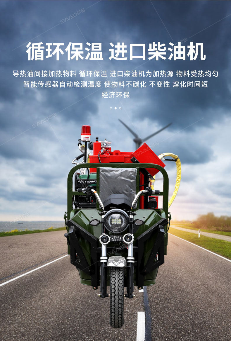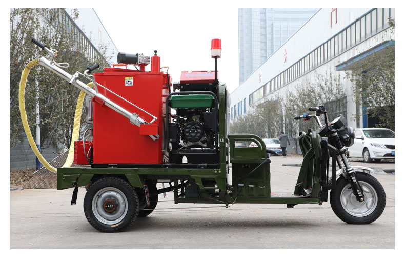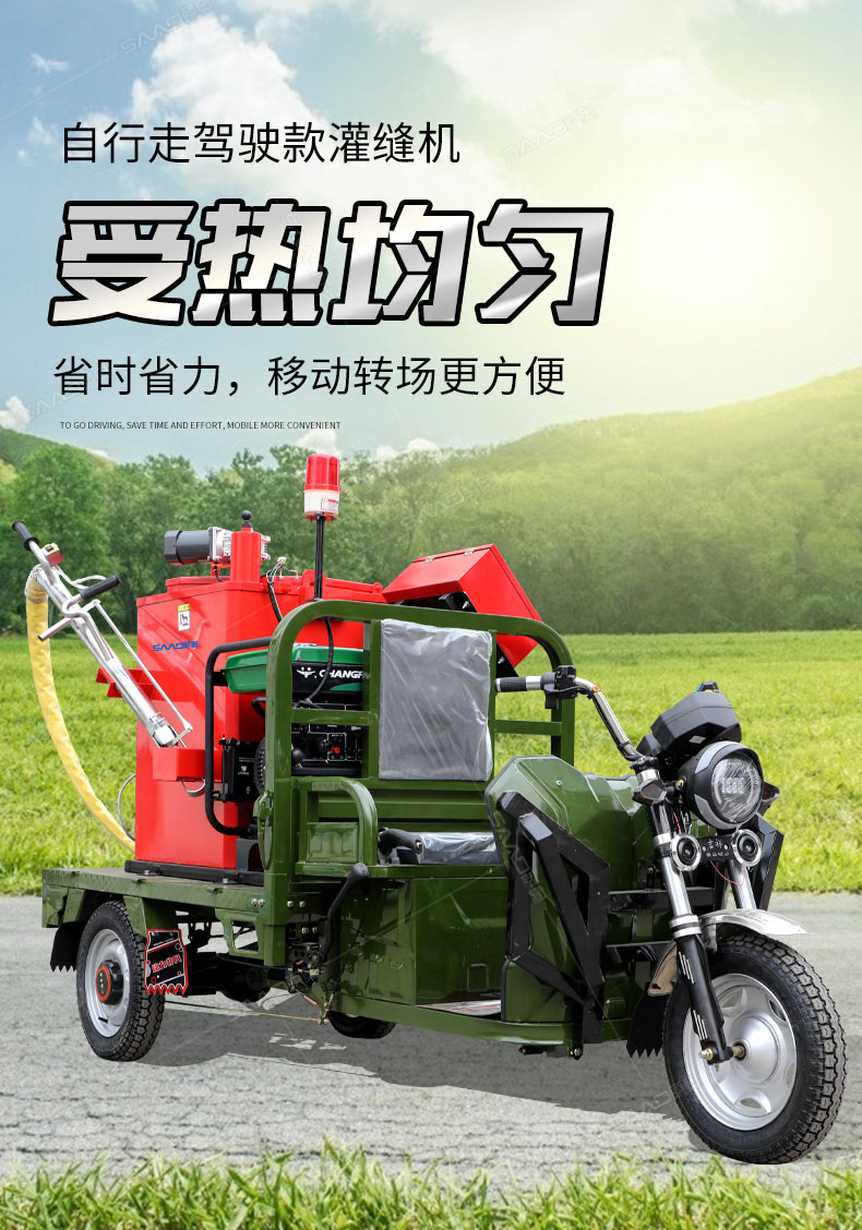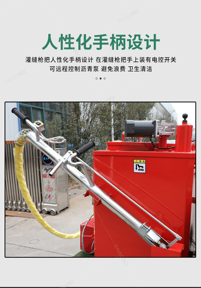 汽油灌縫機(jī)主要有手推式和自行式手持灌縫管操作,采用進(jìn)口柴油燃燒器加熱。在工作時(shí)首先在料箱內(nèi)加入瀝青或灌縫膠,啟動(dòng)發(fā)電機(jī)供電,依次間斷打開導(dǎo)熱油泵開關(guān),燃燒器開關(guān),出料管加熱開關(guān);調(diào)整自動(dòng)溫控系統(tǒng)與材料的溫度相同,通過柴油燃燒器自動(dòng)加熱熔料箱內(nèi)導(dǎo)熱油開始升溫(拖式為強(qiáng)制循環(huán))使材料融化,溫度是通過自控系統(tǒng)來控制。溶料時(shí)間大約30-40分鐘左右。在材料融化、出料管溫度達(dá)到后可以進(jìn)行工作。手持灌縫管對(duì)正裂縫灌縫處理。瀝青泵的出料流量可調(diào)。在工作過程中隨時(shí)添加材料保證工作的連續(xù)性。