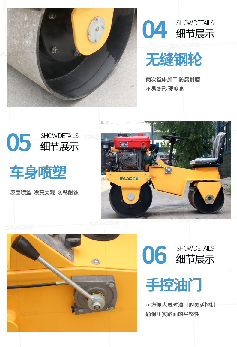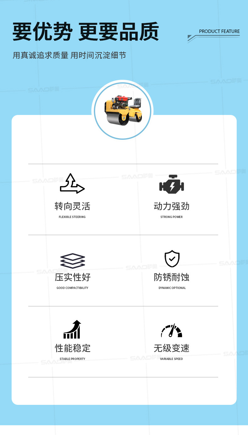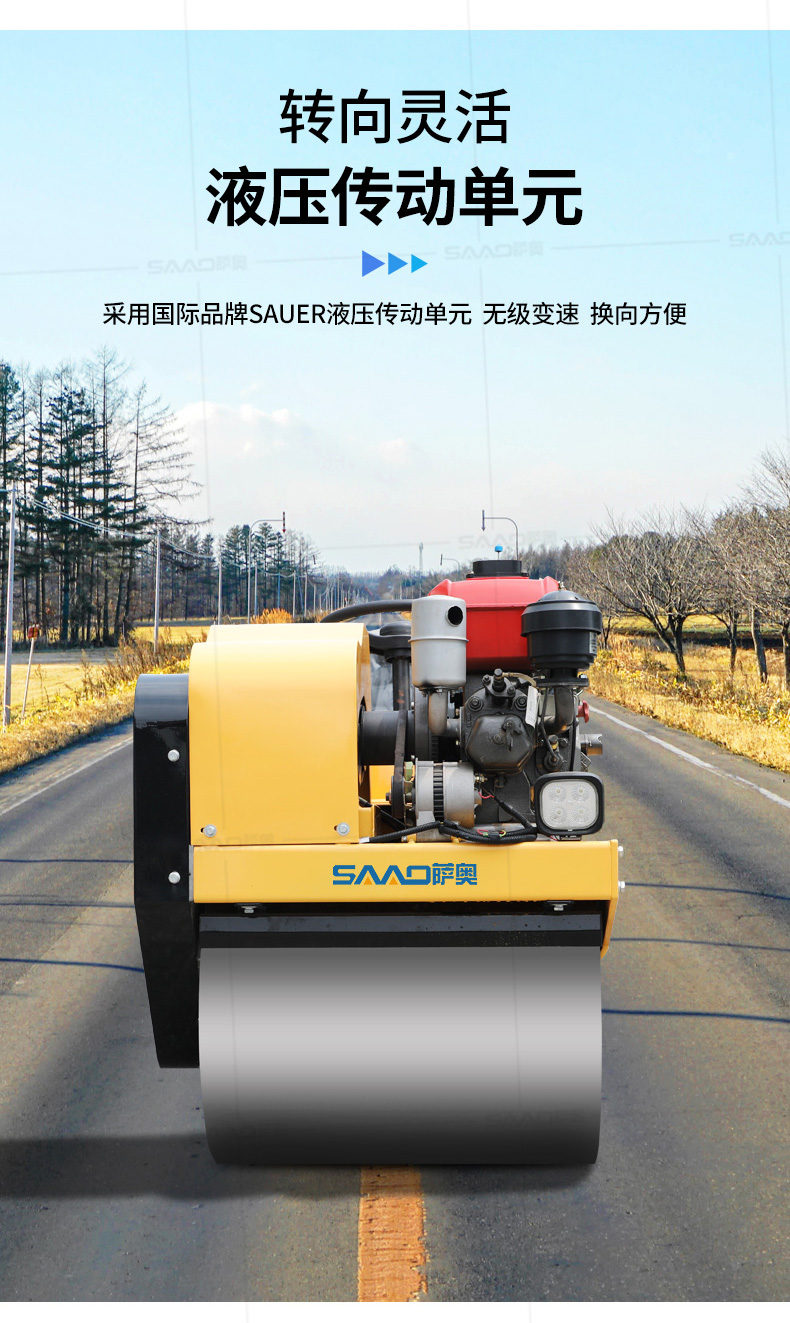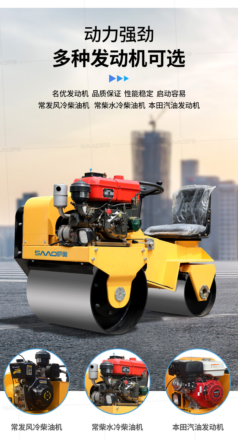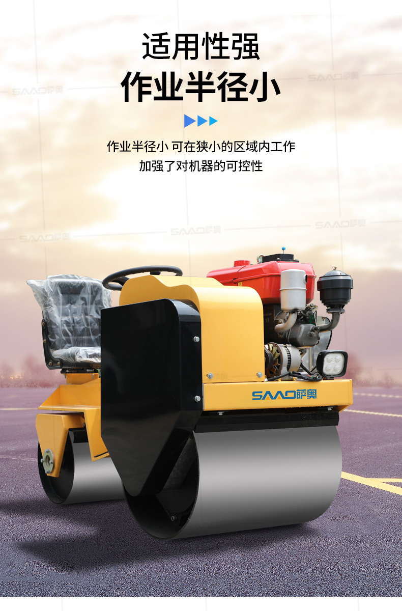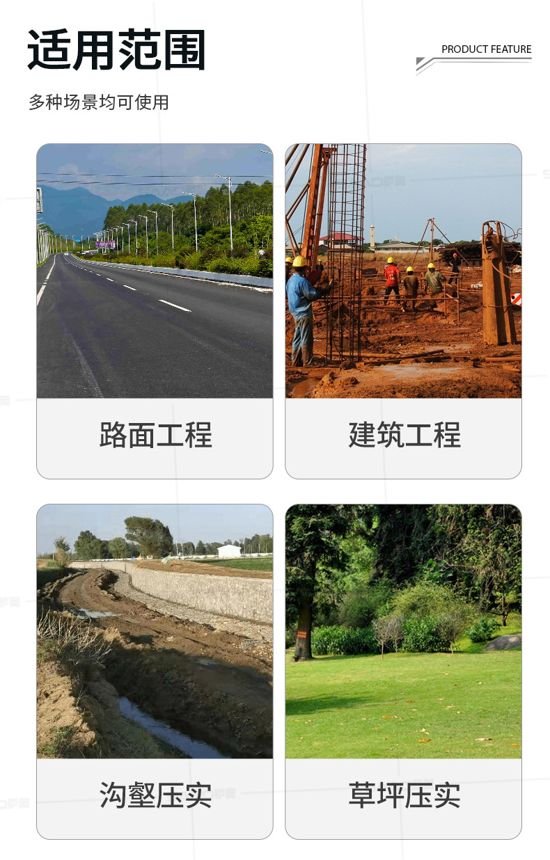 用于壓實瀝青表面,壓實礫石、沙土等工程基礎(chǔ),碾壓草坪,作業(yè)半徑小,可在狹小的區(qū)域內(nèi)工作;國內(nèi)名優(yōu)柴油機,名牌品質(zhì)保證,性能優(yōu)越,啟動容易;